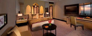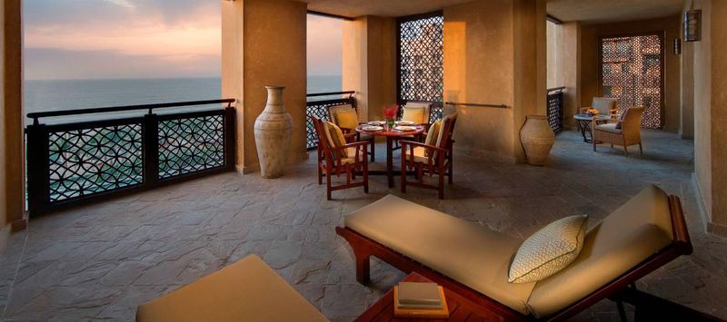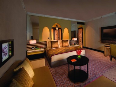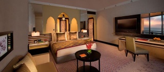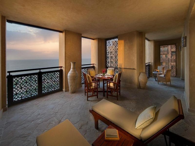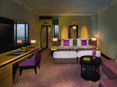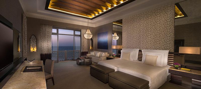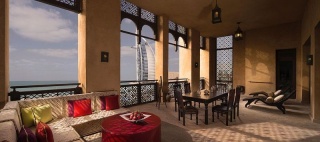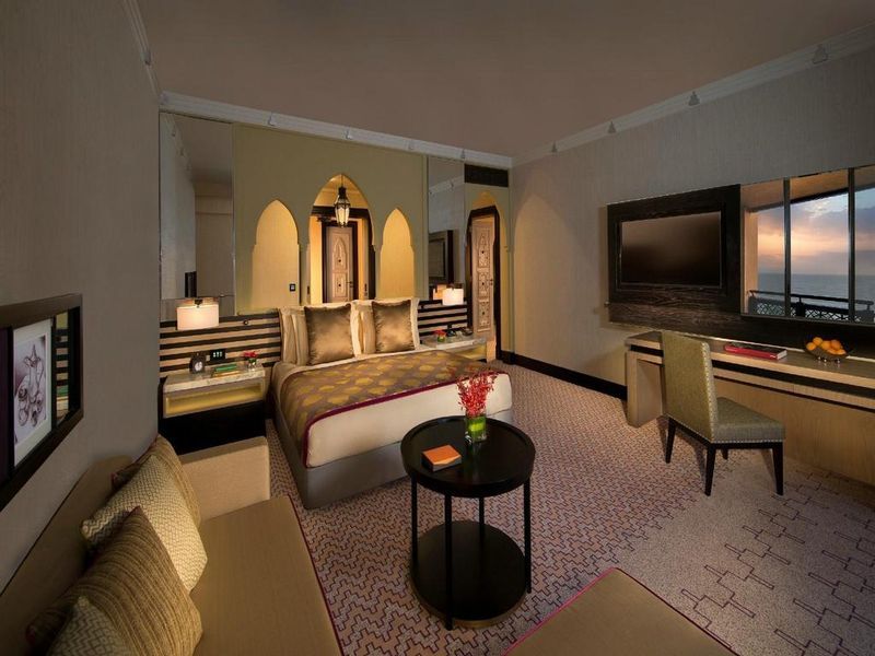 Интерьер огромного номера Ocean Suite оформлен в арабском стиле, отделан темным деревом и сочетает изысканный стиль и современные технические новинки. Каждый сьют отеля оснащен балконом, откуда открывается восхитительный вид на Персидский залив и отель Burj Al Arab.