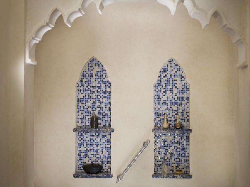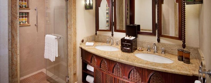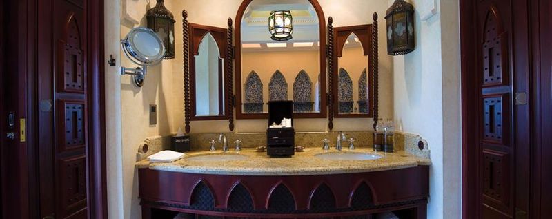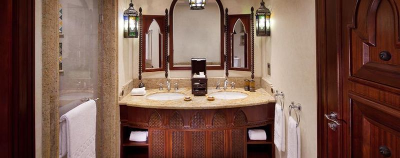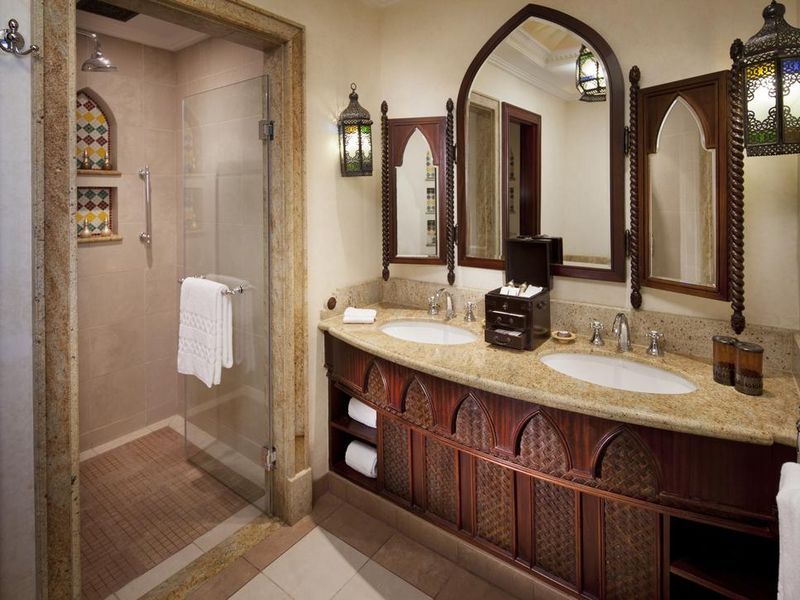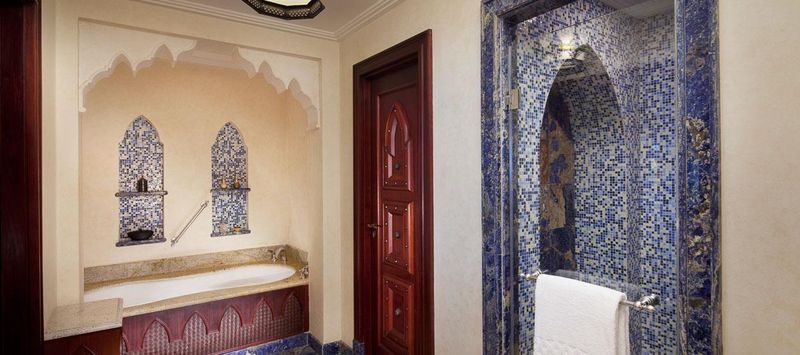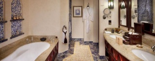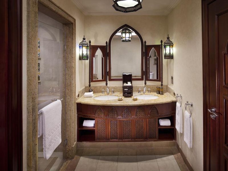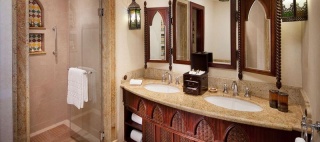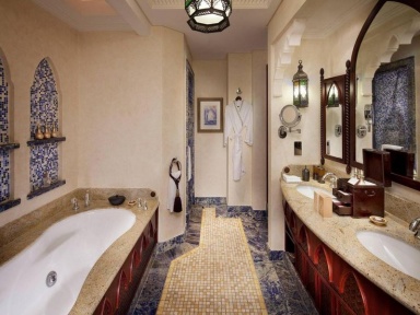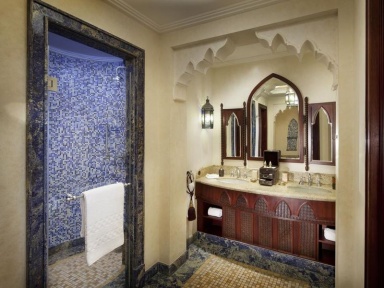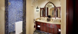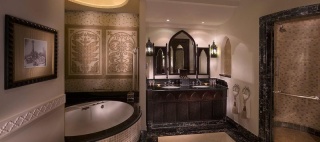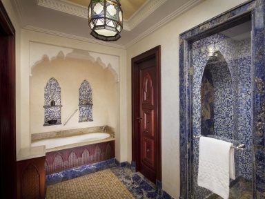 Обе ванные комнаты номера с гардеробной зоной отделаны в арабском стиле и оснащены душевыми кабинами с ливневым душем и отдельной мраморной ванной с джакузи.