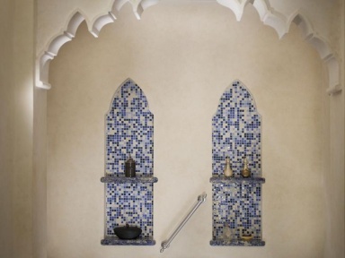 Огромная ванная комната с гардеробной декорирована в арабском стиле и оборудована душевой кабиной с ливневым душем, а также отдельной ванной изысканной формы и широким выбором туалетных принадлежностей.